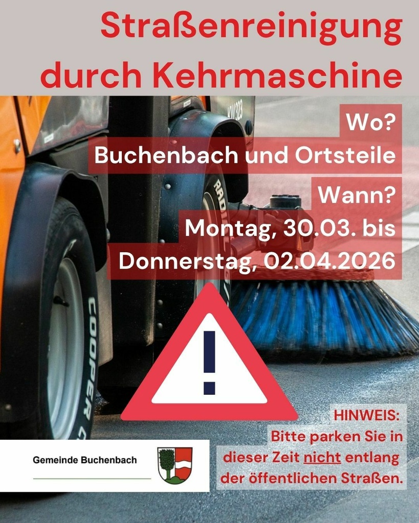 In der 14. Kalenderwoche (30.03. - 02.04.2026) ist wieder eine Kehrmaschine in Buchenbach unterwegs.Wir bitten die Anwohner in dieser Zeit ihre Fahrzeuge nicht entlang der öffentlichen Straßen zu parken, da in diesem Bereich sonst nicht gekehrt werden kann.